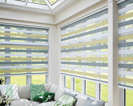 Vision blinds — also known as day and night blinds — are made up of alternating bands of sheer and opaque fabrics that can be positioned for different effects, from filtered daylight to full privacy. They give a contemporary look and let you gently soften light or block it almost completely, depending on how you set the blind.